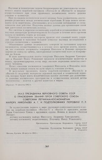 Указ Президиума Верховного Совета СССР о присвоении звания Героя Советского Союза советским летчикам-космонавтам майору Николаеву А.Г. и подполковнику Поповичу П.Р. // «Правда», 19 августа 1962 г.