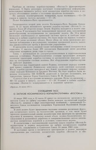 Сообщение ТАСС о запуске космического корабля-спутника «Восток-6» // «Правда», 16 июня 1963 г. (Экстренный выпуск).