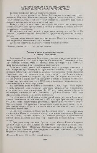 Заявление первой в мире космонавтки Валентины Терешковой перед стартом // «Правда», 16 июня 1963 г. (Экстренный выпуск).