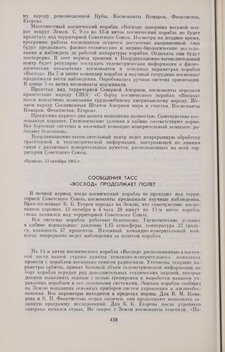 Сообщения ТАСС. «Восход» продолжает полет // «Правда», 14 октября 1964 г.