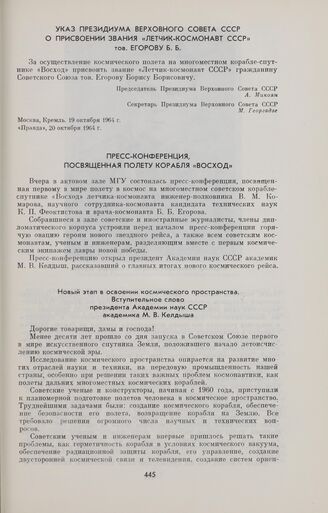 Указ Президиума Верховного Совета СССР о присвоении звания «Летчик-космонавт СССР» тов. Егорову Б.Б. // «Правда», 20 октября 1964 г.