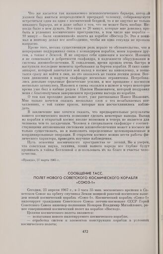 Сообщение ТАСС. Полет нового советского космического корабля «Союз-1» // «Правда», 24 апреля 1967 г.