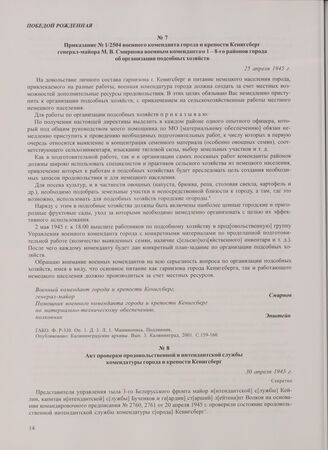 Акт проверки продовольственной и интендантской службы комендатуры города и крепости Кенигсберг. 30 апреля 1945 г. // ГАКО. Ф. Р-330. Оп. 2. Д. 2. Л. 9-12 об. Рукопись. Заверенная копия.