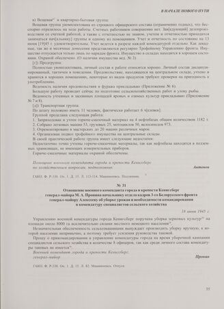 Отношение военного коменданта города и крепости Кенигсберг генерал-майора М.А. Пронина начальнику отдела кадров 3-го Белорусского фронта генерал-майору Алексееву об уборке урожая и необходимости командирования в комендатуру специалистов сельского ...