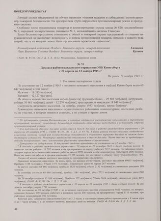 Доклад о работе гражданского управления УВК Кенигсберга с 20 апреля по 12 ноября 1945 г. Не ранее 12 ноября 1945 г. // ГАКО. Ф. Р-330. Оп. 1. Д. 5. Л. 61-63. Машинопись. Подлинник.