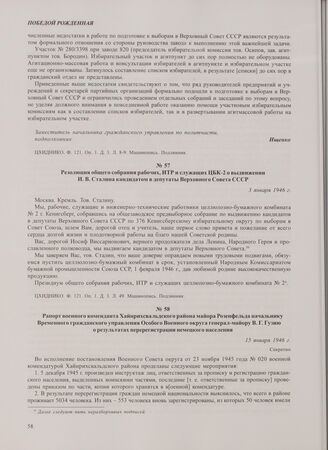 Резолюция общего собрания рабочих, ИТР и служащих ЦБК-2 о выдвижении И.В. Сталина кандидатом в депутаты Верховного Совета СССР. 3 января 1946 г. // ЦХИДНИКО. Ф. 121. Оп. 1. Д. 3. Л. 49. Машинопись. Подлинник.