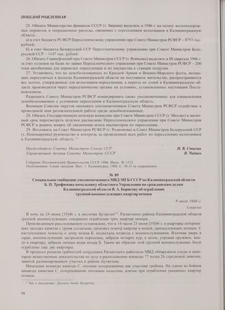 Специальное сообщение уполномоченного МВД-МГБ СССР по Калининградской области Б.П. Трофимова начальнику областного Управления по гражданским делам Калининградской области В.А. Борисову об ограблении группой военнослужащих квартир немцев. 9 июля 1946 г. // ГАКО. Ф. Р-298. Оп. 3. Д. 7. Л. 31. Машинопись. Заверенная копия.