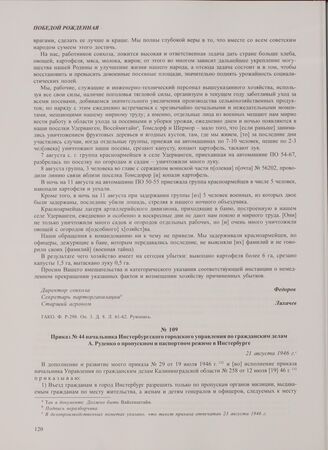 Приказ № 44 начальника Инстербургского городского управления по гражданским делам А. Руденко о пропускном и паспортном режиме в Инстербурге. 21 августа 1946 г. // ГАКО. Ф. Р-311. Оп. 1. Д. 3. Л. 25-26. Машинопись. Подлинник.