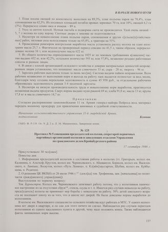 Протокол № 5 совещания председателей колхозов, секретарей первичных партийных организаций колхозов и заведующих отделами Управления по гражданским делам Кройцбургского района. 17 сентября 1946 г.