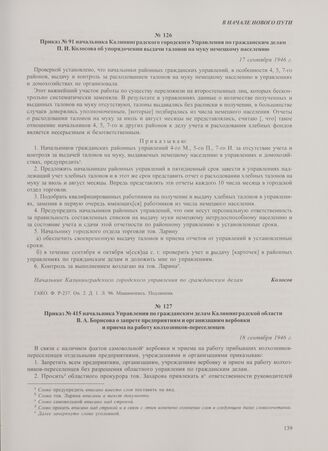 Приказ № 91 начальника Калининградского городского Управления по гражданским делам П.И. Колосова об упорядочении выдачи талонов на муку немецкому населению. 17 сентября 1946 г.