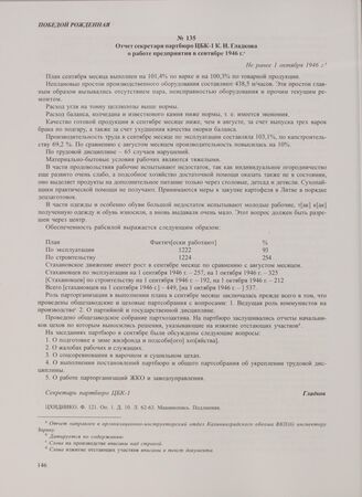 Отчет секретаря партбюро ЦБК-1 К.Н. Гладкова о работе предприятия в сентябре 1946 г. Не ранее 1 октября 1946 г. // ЦХИДНИКО. Ф. 121. Оп. 1. Д. 10. Л. 62-63. Машинопись. Подлинник.