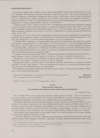 Политическое донесение о настроениях колхозников-переселенцев в Полесском районе. 15 октября 1946 г. // ЦХИДНИКО. Ф. 121. Оп. 1. Д. 10. Л. 140-142. Рукопись. Подлинник.