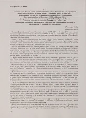 Специальное сообщение начальника транспортного отдела Министерства государственной безопасности Литовской железной дороги Салмина начальнику политотдела Управления по гражданским делам Калининградской области о выполнении Постановления Совета Министров СССР от 21 июня 1946 г. «О мероприятиях по хозяйственному устройству Кенигсбергской области» и приказа министра путей сообщения СССР от 1 июля 1946 г. «О мероприятиях по укреплению участков и предприятий Литовской железной дороги, расположенных в Калининградской области». 17 октября 1946 г.