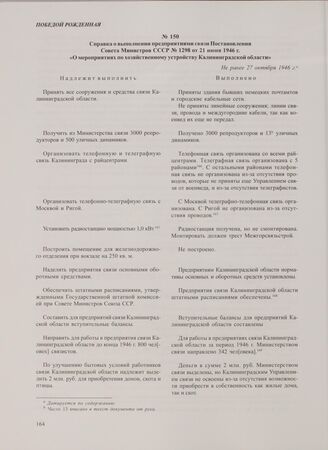 Справка о выполнении предприятиями связи Постановления Совета Министров СССР № 1298 от 21 июня 1946 г. «О мероприятиях по хозяйственному устройству Калининградской области». Не ранее 27 октября 1946 г. // ГАКО. Ф. Р-241. Оп. 9. Д. 3 а. Л. 43-44. Отпуск.