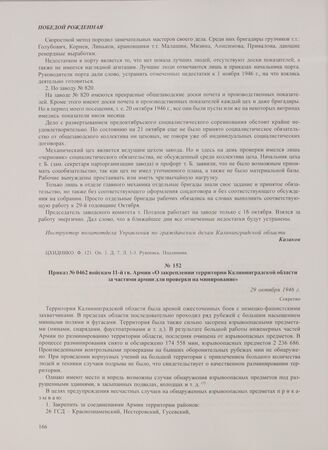 Приказ № 0462 войскам 11-й гв. Армии «О закреплении территории Калининградской области за частями армии для проверки на минирование». 29 октября 1946 г. // ГАКО. Ф. Р-237. Оп. 1. Д. 6. Л. 8. Машинопись. Заверенная копия.