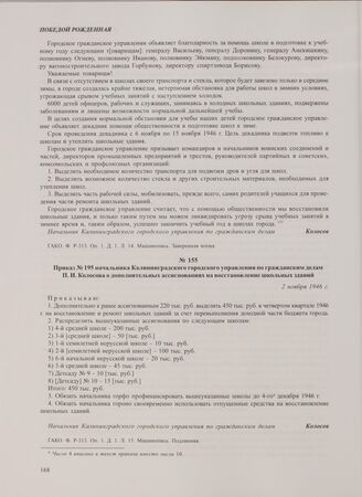 Приказ № 195 начальника Калининградского городского управления по гражданским делам П.И. Колосова о дополнительных ассигнованиях на восстановление школьных зданий. 2 ноября 1946 г.