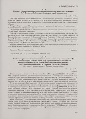 Приказ № 151 начальника Калининградского областного отдела народного образования П.А. Долгачева об объявлении благодарности работникам отдела. 5 ноября 1946 г. // ГАКО. Ф. Р-462. Оп. 2. Д. 2. Л. 17. Машинопись. Заверенная копия.