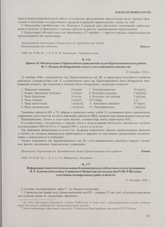 Приказ № 148 начальника Управления по гражданским делам Краснознаменского района Ф.С. Котина об обнаружении клада и учете найденного имущества. 30 декабря 1946 г. // ГАКО. Ф. Р-362. Оп. 1. Д. 2. Л. 133. Машинопись. Подлинник.