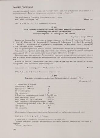 Справка о работах по радиофикации Калининградской области в 1946 г. 15 января 1947 г. // ГАКО. Ф. P-241. Оп. 9. Д. 3 а. Л. 118. Рукопись.