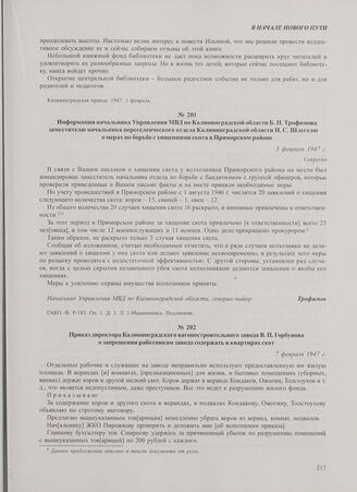 Приказ директора Калининградского вагоностроительного завода В.П. Горбунова о запрещении работникам завода содержать в квартирах скот. 7 февраля 1947 г. // ГАКО. Ф. Р-192. Оп. 7. Д. 13. Л. 57-57 об. Рукопись.