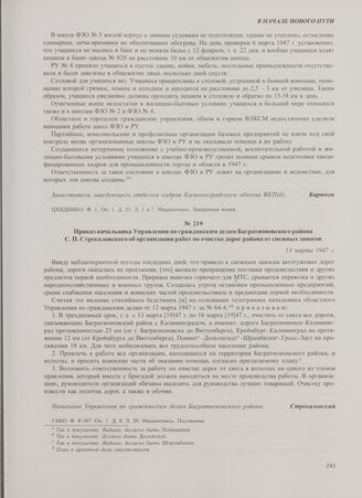 Приказ начальника Управления по гражданским делам Багратионовского района С.П. Стрекаловского об организации работ по очистке дорог района от снежных заносов. 13 марта 1947 г. // ГАКО. Ф. Р-307. Оп. 1. Д. 8. Л. 20. Машинопись. Подлинник.