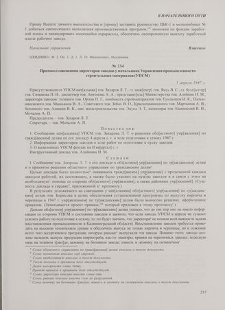 Протокол совещания директоров заводов у начальника Управления промышленности строительных материалов (УПСМ). 5 апреля 1947 г.