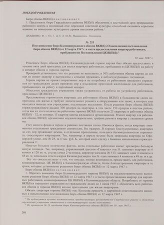 Постановление бюро Калининградского обкома ВКП(б) «О выполнении постановления бюро обкома ВКП(б) от 12 марта 1947 г. в части предоставления квартир работникам, прибывшим по Постановлению ЦК ВКП(б)». 10 мая 1947 г. // ЦХИДНИКО. Ф. 1. Оп. 1. Д. 8. Л. 86-88. Машинопись. Подлинник.