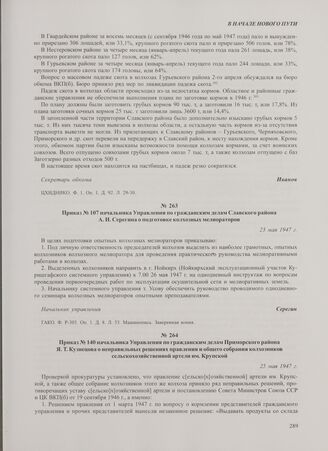 Приказ № 140 начальника Управления по гражданским делам Приморского района Я.Т. Кузнецова о неправильных решениях правления и общего собрания колхозников сельскохозяйственной артели им. Крупской. 25 мая 1947 г. // ГАКО. Ф. Р-331. Оп. 1. Д. 2. Л. 183-183 об. Машинопись. Подлинник.