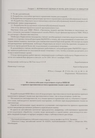 Из отчета отбельно-отделочного отдела НИИЛВ о прямом противогнилостном крашении ткани в цвет хаки. Москва. 1940 г. // РГА в г. Самаре. Ф. Р-199. Оп. 1-1. Д. 327. Л. 1, 16а. Подлинник. Машинопись.