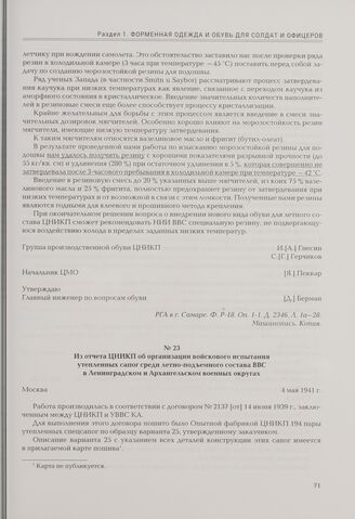 Из отчета ЦНИКП об организации войскового испытания утепленных сапог среди летно-подъемного состава ВВС в Ленинградском и Архангельском военных округах. Москва, 4 мая 1941 г.