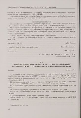 Инструкция по проведению массового испытания опытной рабочей обуви, изготовленной ЦНИКП для краснофлотцев отдельных специальностей ВМФ. Москва, 5 мая 1941 г. // РГА в г. Самаре. Ф. Р-18. Оп. 1-1. Д. 2461. Л. 15—15об. Машинопись. Подлинник.