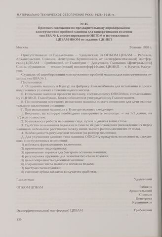 Протокол совещания по предварительному апробированию конструктивно-пробной машины для выворачивания голенищ тип ВВА № 1, спроектированной ОКПОМ и изготовленной ЦПБЛМ НКОМ по заданию ЦНИКП. Москва, 24 июня 1938 г.