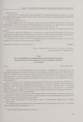 Из отчета ЦНИКЗ о расширенном испытании обувной кирзы для армобуви, изготовленной по методу комбината «Искож» («на мазях»). Киров, 22 декабря 1942 г. // РГА в г. Самаре. Ф. Р-242. Оп. 3-1. Д. 148. Л. 25—26, 32—34. Подлинник. Машинопись.