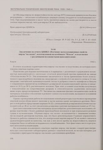 Заключение по отчету ЦНИКЗ «Изучение эксплуатационных свойств кирзы "на мазях", изготовленной на комбинате "Искож", и пласткожи с различными волокнистыми наполнителями». Киров, 1942 г. // РГА в г. Самаре. Ф. Р-242. Оп. 3-1. Д. 148. Л. 4. Подлинник. Машинопись.