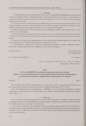 Из отчета ЦНИКЗ об освоении в производстве двухслойной шорно-седельной кирзы на базе утяжеленной, крашеной двухслойной кирзы для предметов людского снаряжения командующего состава КА. Москва, 1943 г. // РГА в г. Самаре. Ф. Р-242. Оп. 3-1. Д. 168. Л. 12, 17об. Подлинник. Машинопись.