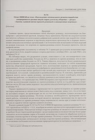 Отчет НИИЛВ по теме «Нахождение оптимального режима выработки спецверевки из разных видов сырья для нужд обороны» - раздел «Замена льняной нитки пряжей-ровницей в авиационных веревках». [Москва], 1942 г.