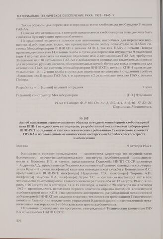 Акт об испытании первого опытного образца походной конвейерной хлебопекарной печи КПН-1 на одноосном автоприцепе, разработанной механической лабораторией ВНИИХП по заданию и тактико-техническим требованиям Технического комитета ГИУ КА и изготовленной механическими мастерскими 2-го Московского треста хлебопечения. Москва, 9 октября 1942 г. // РГА в г. Самаре. Ф. Р-165. Оп. 1-1. Д. 587. Л. 1—2об, 6—13, 86. Подлинник. Машинопись.