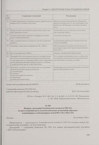 Журнал заседания Технического комитета ГИУ КА по рассмотрению результатов войсковых испытаний образцов конвейерных хлебопекарных печей ФТЛ-П1 и ФТЛ-П2. Москва, 26 октября 1944 г.