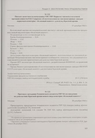 Протокол заседания Технического комитета ГИУ КА по введению на довольствие Красной армии нового вида консерва «белковый паштет». Москва, 28 декабря 1943 г. // РГА в г. Самаре. Ф. Р-623. Оп. 1-1. Д. 884. Л. 11—12. Машинопись. Заверенная копия.