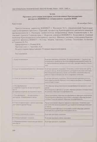 Протокол дегустации консервов, изготовленных Краснодарским филиалом ВНИИКП по специальному заданию ВМФ. Краснодар, 30 октября 1945 г. // РГА в г. Самаре. Ф. Р-360. Оп. 22-1. Д. 222. Л. 1-2, 40-40об. Машинопись. Заверенная копия.