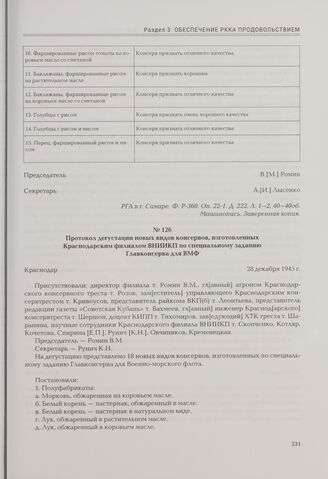 Протокол дегустации новых видов консервов, изготовленных Краснодарским филиалом ВНИИКП по специальному заданию Главконсерва для ВМФ. Краснодар, 28 декабря 1945 г. // РГА в г. Самаре. Ф. Р-360. Оп. 2-1. Д. 222. Л. 41—42. Машинопись. Заверенная копия.