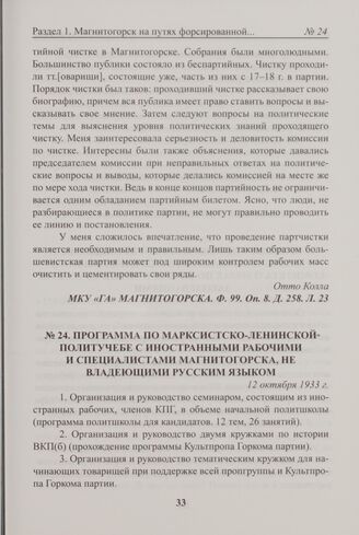Программа по марксистско-ленинской политучебе с иностранными рабочими и специалистами Магнитогорска, не владеющими русским языком. 12 октября 1933 г.