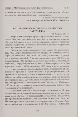 Прибыл культэшелон имени XVII партсъезда. 18 февраля 1934 г. // Магнитогорский рабочий. 1934. 18 февраля.