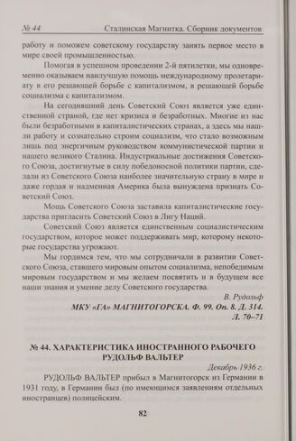 Характеристика иностранного рабочего Рудольф Вальтер. Декабрь 1936 г. // МКУ «ГА» Магнитогорска. Ф. 99. Оп. 8. Д. 531. Л. 106-107,109.
