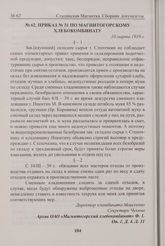 Приказ № 31 по Магнитогорскому хлебокомбинату. 10 марта 1939 г. // Архив ОАО «Магнитогорский хлебокомбинат». Ф. 1. Оп. 1. Д. 4. Л. 31.