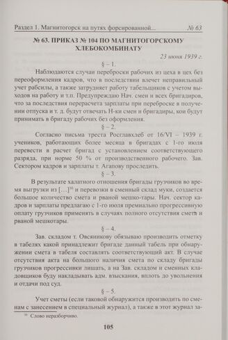 Приказ № 104 по Магнитогорскому хлебокомбинату. 23 июня 1939 г. // Архив ОАО «Магнитогорский хлебокомбинат». Ф. 1. Оп. 1. Д. 4. Л. 87 об.