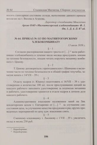 Приказ № 113 по Магнитогорскому хлебокомбинату. 13 июля 1939 г. // Архив ОАО «Магнитогорский хлебокомбинат». Ф. 1. Оп. 1. Д. 4. Л. 92.