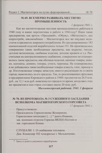 Из протокола № 3 суженного заседания исполкома Магнитогорского горсовета. 17 февраля 1941 г. // МКУ «ГА» Магнитогорска. Ф. 10. Оп. 1. Д. 359. Л. 4-4 об.