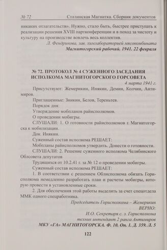 Из протокола № 4 суженного заседания исполкома Магнитогорского горсовета. 4 марта 1941 г. // МКУ «ГА» Магнитогорска. Ф. 10. Оп. 1. Д. 359. Л. 5.