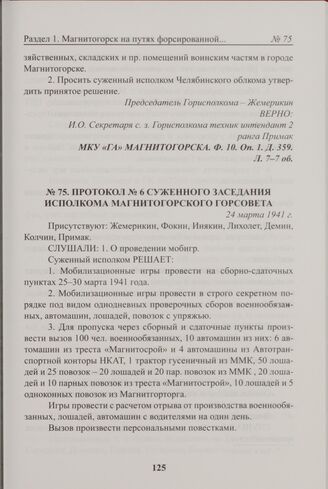 Протокол № 6 суженного заседания исполкома Магнитогорского горсовета. 24 марта 1941 г. // МКУ «ГА» Магнитогорска. Ф. 10. Оп. 1. Д. 359. Л. 8-8 об.